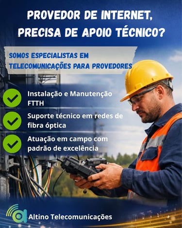 A Altino Telecomunicações atua no ramo de instalações FTTH, ativações e manutenção de assinantes, oferecendo suporte completo a provedores de internet que buscam escala, qualidade técnica e confiabilidade operacional. Instalação e manutenção de sistemas de CFTV, para provedores que desejam aumentar o portfólio de serviços, fidelizar clientes e gerar novas receitas. Atuamos diretamente no atendimento ao assinante final, com foco especial nas operações, garantindo a entrega do serviço com qualidade e eficiência até o ponto do cliente. Nossa operação é realizada por equipes técnicas qualificadas, preparadas para atuar em campo com agilidade, organização e comprometimento com os níveis de serviço (SLA) estabelecidos, sempre buscando minimizar impactos e assegurar a continuidade dos serviços. Nossa atuação é baseada em processos bem definidos, boas práticas técnicas e constante atualização profissional, acompanhando a evolução das tecnologias do setor de telecomunicações. Prezamos pela excelência operacional, pela transparência nas relações e pela responsabilidade na execução dos serviços. Entendemos que a conectividade é essencial no dia a dia das pessoas e das empresas, por isso trabalhamos com foco em estabilidade, confiabilidade e rapidez na solução de demandas técnicas. Nosso compromisso é contribuir para a qualidade da rede, a satisfação dos assinantes e o cumprimento dos SLAs, atuando como uma extensão técnica confiável da operação de telecomunicações de nossos parceiros.